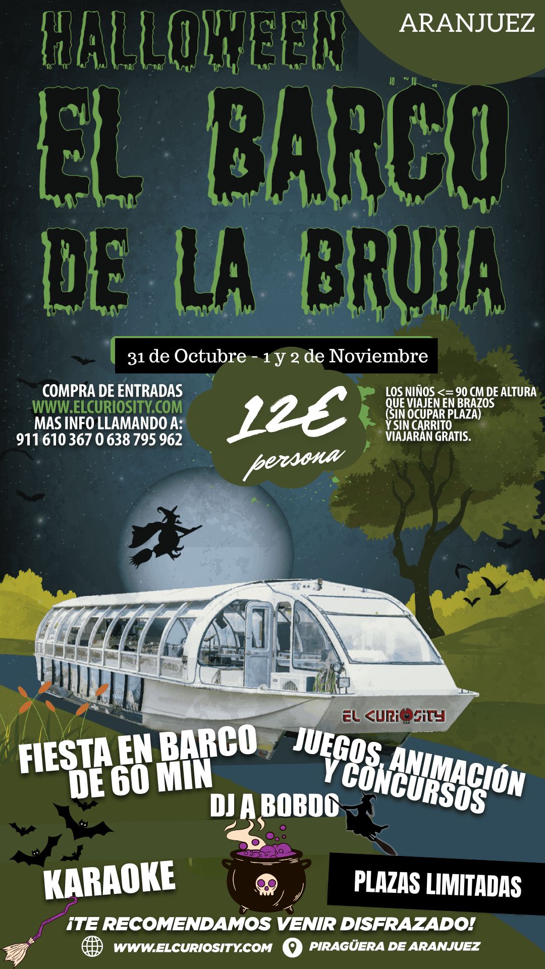 «Vive una auténtica aventura abordo del Barco de la bruja. Es el único barco de Madrid y ahora ofrece un programa para Halloween realmente terrorífico. Sesenta minutos de animación abordo de nuestro barco donde nuestra peculiar bruja no dejará un momento para el descanso.»