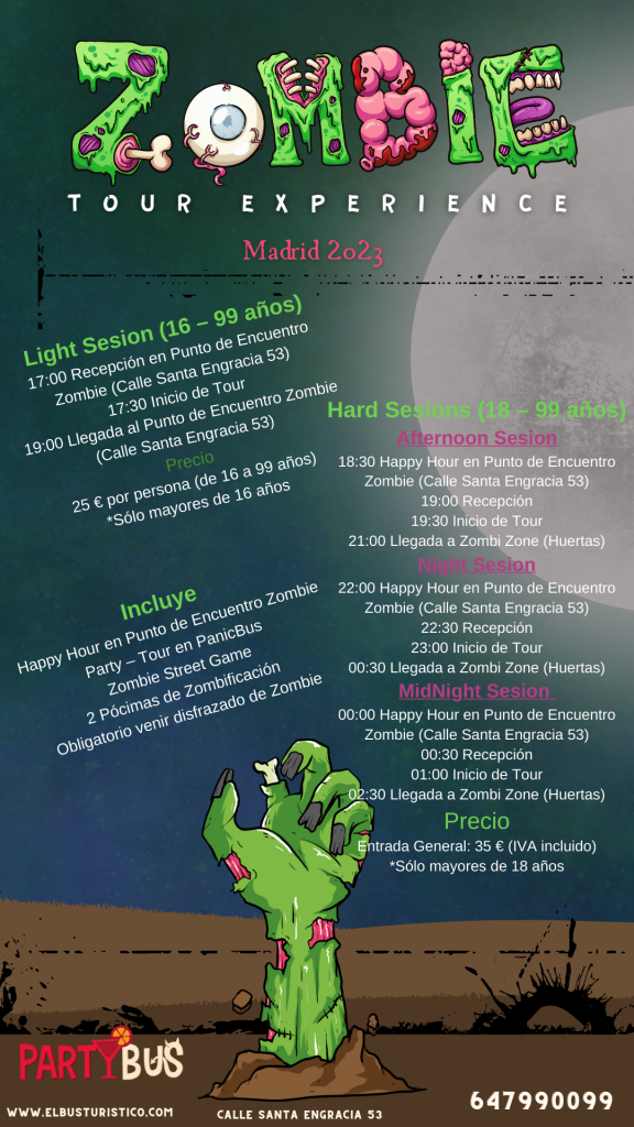 Te ofrecemos una experiencia zombie sin igual. Un autobús cargado de zombies que soltamos en medio de Madrid. El objetivo es convertir al mayor número de personas. Un traguito de nuestra pócima de zombificación y comienza la fiesta.